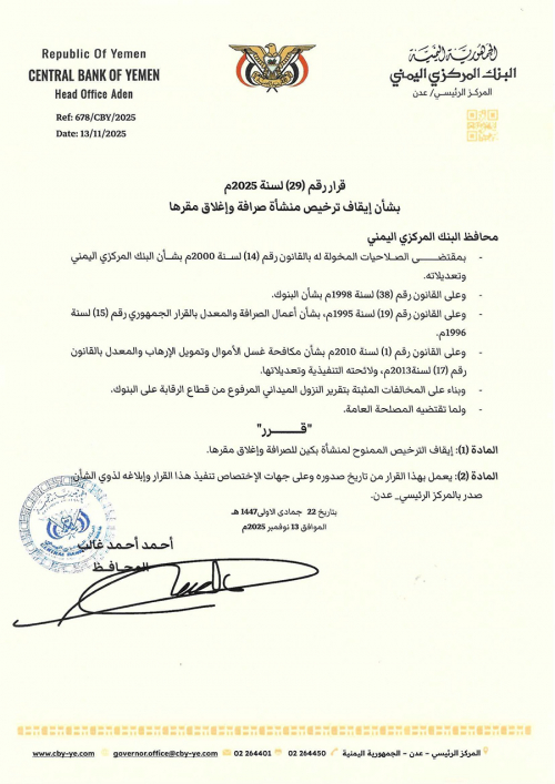 أصدر محافظ البنك المركزي أ. أحمد أحمد غالب قرار رقم (29) لعام 2025م، بشأن إيقاف الترخيص الممنوح لمنشأة للصرافة المخالفة وإغلاق مقرها، والمثبتة بتقرير النزول الميداني المرفوع من قطاع الرقابة على البنوك.