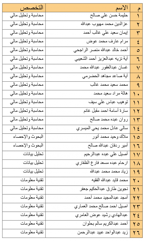 الإخوة والأخوات المدونة أسمائهم في الكشف التالي الذين تقدموا للاختبار والمقابلة عبر شركة بي كي إف – اليمن، PKF Yemen .. عليهم مراجعة الإدارة العامة للموارد البشرية في البنك المركزي اليمني – المركز الرئيسي – عدن، خلال يومي الأربعاء والخميس الموافق 05 - 06 نوفمبر 2025م.